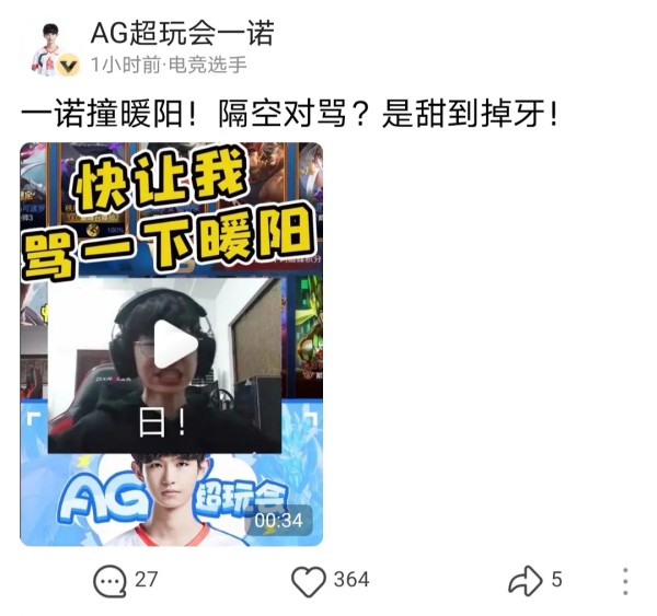 一诺暖阳一起排位后,两人都发了抖音,暖阳还发了两条
