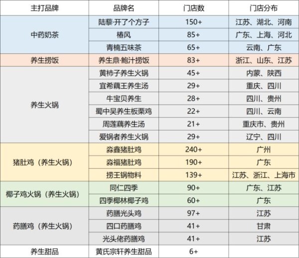 在中药奶茶领域,开了个方子、椿风、青楠五味茶等品牌已初具规模;而在养生火锅方面,猪肚鸡、椰子鸡等品牌更是拥有了百家以上的连锁店。