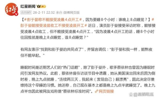 这场关于"凌晨四点"的讨论,意外撕开了更深刻的社会切口。就在不久前,歌手蔡依林在采访中透露自己坚持"九点半睡觉"的养生哲学,称"连续三天早睡后,镜子里的自己美到发光"。两种截然不同的睡眠观在舆论场激烈碰撞——一边是彭于晏代表的"现实主义"困顿,一边是蔡依林实践的"理想主义"自律,恰似当代人在健康渴望与生活重压间的真实写照。
