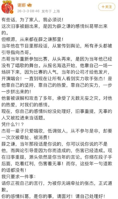 3月3日,谢娜一早冲上热搜,这一次不是秀恩爱,而是直接发布长文,公开喊话薛之谦要求道歉,态度之刚让全网震惊。
