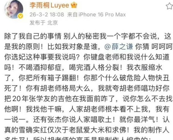事情起因于李雨桐的发文,她在爆料中暗指两位歌手,还称薛之谦私下评价张杰曲风普通。网友也迅速扒出,薛之谦早年在节目中也曾含沙射影,疑似暗讽张杰靠身边人助力。两段言论叠加,瞬间点燃争议。