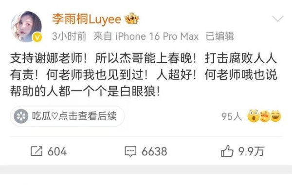 谢娜的中计让李雨桐尝到了这个方法的甜头,于是她顺着谢娜的回应,再次发文,说她支持谢娜,还说难怪张杰能上春晚,这句没头没尾的话,更像是说张杰能上春晚都是因为谢娜的能量大。