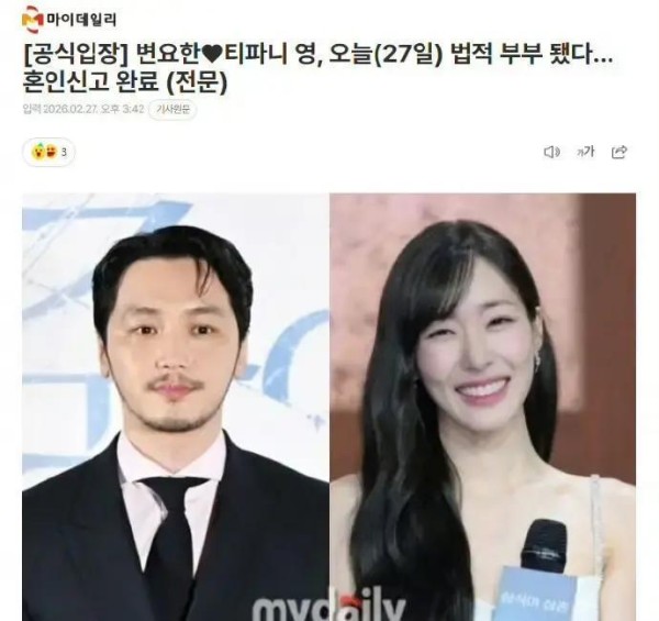 少女时代Tiffany与演员卞耀汉官宣恋情:正以结婚为前提认真交往
