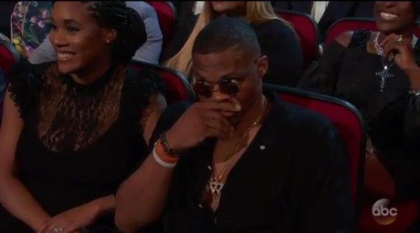 紧接着,镜头又转到了威斯布鲁克,只见威少带着墨镜,手捂住嘴,极力不让自己笑出来,众所周知,因为杜兰特的离开,导致二少关系恶化,杜兰特也没少遭受指责和批评,但上赛季,他在勇士发挥出色,屡屡在关键时刻命中投篮,是勇士队能够击败骑士获得总冠军的绝对主力,他也因此获得了总决赛MVP。