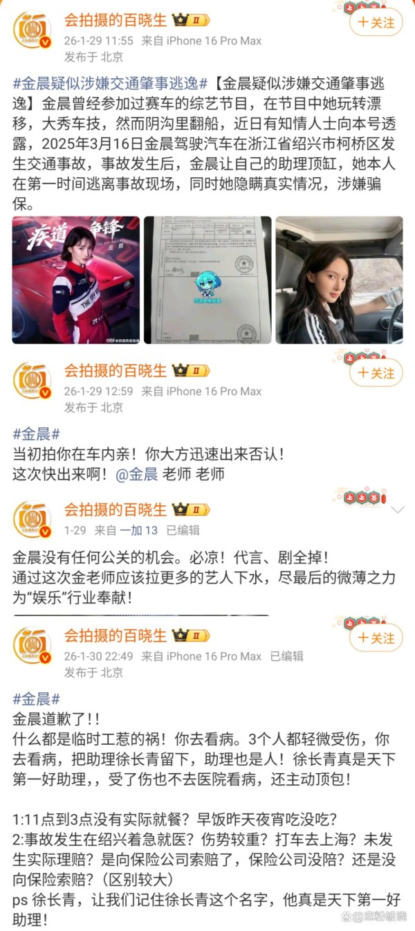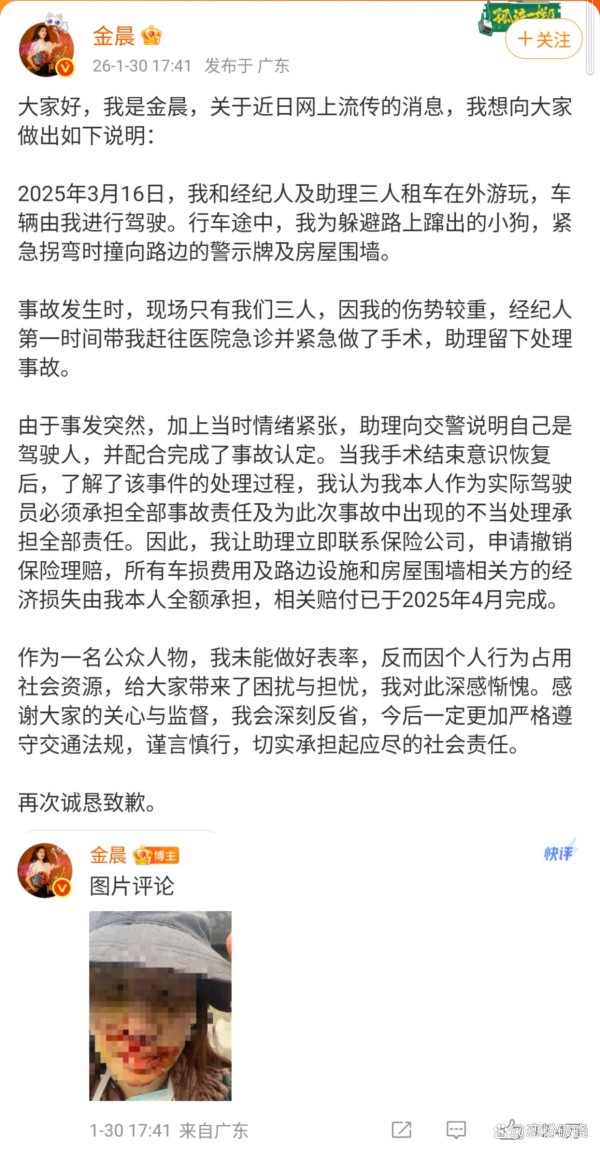 2025年3月16日金晨、经纪人、助理3人租车游玩,为躲避小狗撞上警示牌和围墙,金晨本人伤势较重由经纪人陪同至上海就医,助理留下处理相关事宜,紧张之下称自己为驾驶人,评论区是金晨的受伤照(打码)。