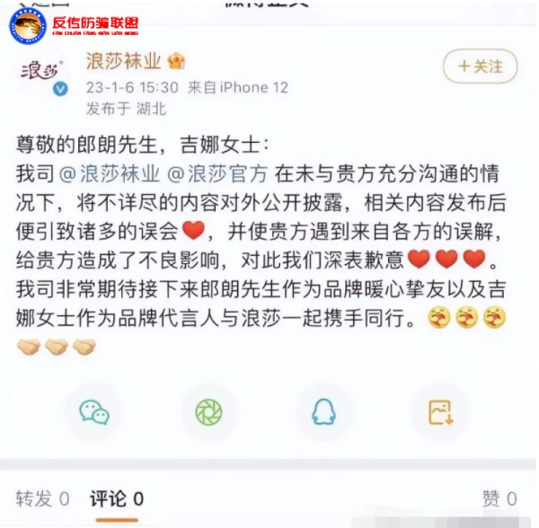 随后1月6日,浪莎集团子公司浪莎袜业(全称:浪莎针织有限公司)发表道歉声明,称在未与郎朗吉娜方充分沟通的情况下披露不详尽内容,浪莎深表歉意,并期待之后的代言合作。