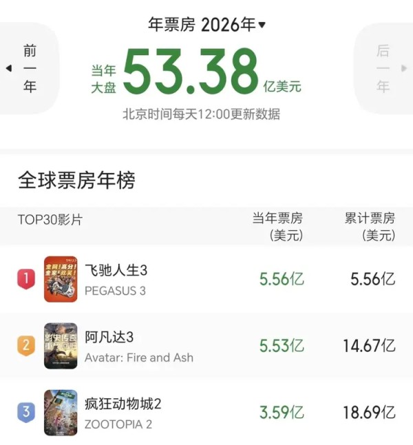 据国内的电影平台显示,现在2026年中国内地的年度总票房刚突破100亿人民币,而仅仅一部《飞驰人生3》就独占了超38亿人民币。另外,今年春节档上映的所有新片,各自票房加起来都没能追上《飞驰人生3》。