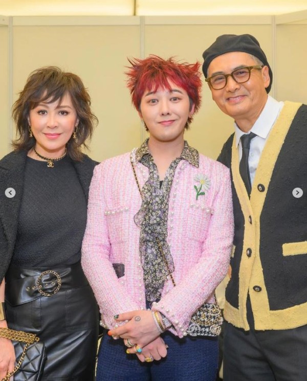 在所分享的照片中,刘嘉玲、周润发和权志龙各自展现了不同的风格与气质。刘嘉玲身着一套黑色服饰,尽显其独特气质。周润发则以白色衬衫配以深色开衫,展现出一种年轻活力。而站在中央的权志龙,身着粉色外套,红色发色更是引人注目,显得分外亮眼。