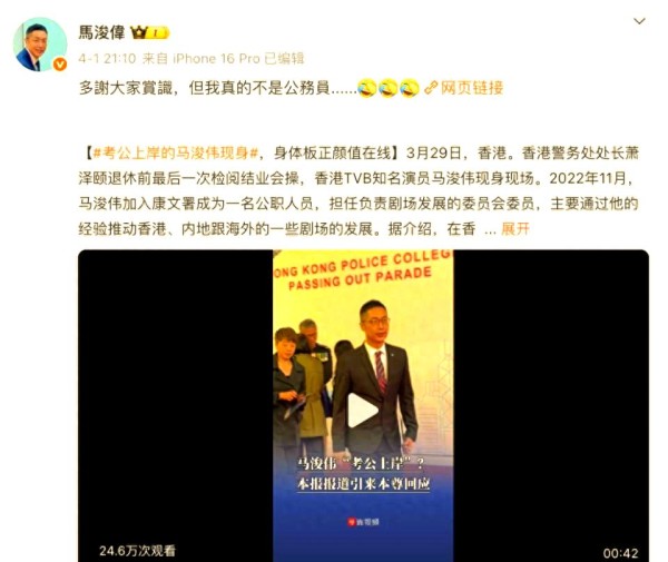 近日,香港警务处处长萧泽颐在退休前主持了最后一次结业会操的检阅,现场出现了53岁TVB知名演员马浚伟的身影,引发网友热议,纷纷称赞其体态矫健、颜值依旧。然而,有媒体称马浚伟已成功加入公务员行列,对此,他在微博上作出回应,否认自己是公务员,并表示感谢大家的赏识。