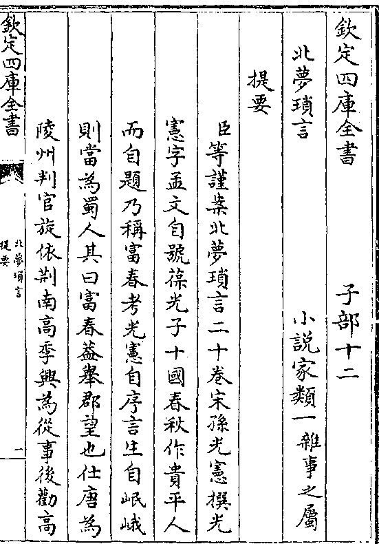 《四库全书总目》卷一百四十子部小说家类:《北梦琐言》二十卷(内府藏本)宋孙光宪撰。光宪字孟文,自号葆光子。《十国春秋》作贵平人,而自题仍称富春。考光宪自序,言生自岷峨,则当为蜀人,其曰富春,盖举郡望也。仕唐为陵州判官,旋依荆南高季兴为从事,后劝高继冲以三州归宋,太祖嘉之,授黄州刺史以终。《五代史·荆南世家》载之甚明。旧以为五代人者,误矣。所著有《荆台集》、《橘斋集》、《笔佣集》、《巩湖集翫》、《蚕书》、《续通历》等书,自宋代已散佚,惟是书独传於后。其曰《北梦琐言》者,以《左传》称田於江南之梦,而荆州在江北,故以命名,盖仕高氏时作也。所载皆唐及五代士大夫逸事,每条多载某人所说,以示有徵,盖用《杜阳杂编》之例。其记载颇猥杂,叙次亦颇冗沓,而遗文琐语,往往可资考证。故宋李昉等编《太平广记》,多采其文。晁公武《读书志》载光宪《续通历》十卷,辑唐及五代事,以续马总之书,参以黄巢、李茂贞、刘守光、按巴坚【按“按巴坚”原作“阿保机”,今改正。】、吴、唐、闽、广、吴越、两蜀事迹,太祖以所记多不实,诏毁其书。而此书未尝议及,则语不甚诬可知矣。世所行者凡二本,一为明商濬《稗海》所刻,脱误殆不可读。近时扬州新刻,乃元华亭孙道明所藏,犹宋时陕西刊版,差完整有绪。故今以扬州本著录,不用商氏本云。