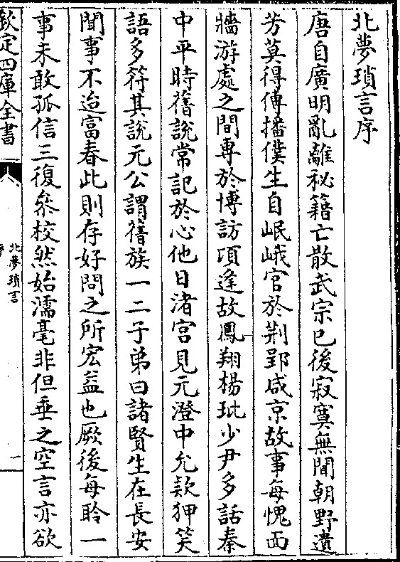 孙光宪以《北梦琐言》传世,自序云:唐自广明乱离,秘籍亡散,武宗已后,寂寞无闻,朝野遗芳,莫得传播。仆生自岷峨,官于荆郢。咸京故事,每愧面墙,游处之间,专于博访。顷逢故凤翔杨玭少尹,多话秦中平时旧说,常记于心。他日渚宫见元澄中允,款狎笑语,多符其说。元公谓旧族一二子弟曰:“诸贤生在长安,闻事不迨富春,此则存好问之所宏益也。”厥后每聆一事,未敢孤信,三复参校,然始濡毫。非但垂之空言,亦欲因事劝戒。三纪收拾筐箧,爰因公退,咸取编连。先以唐朝达贤一言一行列于谈次,其有事类相近,自唐至后唐、梁、蜀、江南诸国所得闻知者,皆附其末,凡纂得事成三十卷。《禹贡》云:“云土梦作乂。”《传》有“畋于江南之梦”。鄙从事于荆江之北,题曰《北梦琐言》,琐细形言,大即可知也。虽非经纬之作,庶勉后进子孙,俾希仰前事,亦丝麻中菅蒯也。通方者幸勿多诮焉。