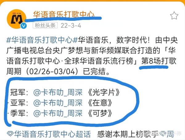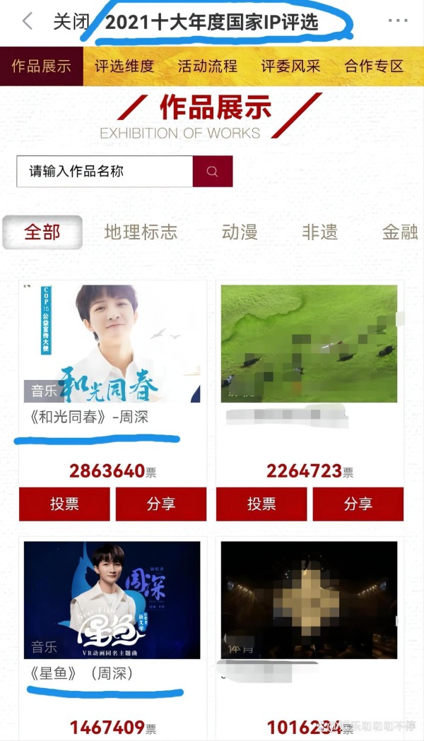 华语音乐打歌中心今年第八场周深包揽前三,五大纬度赛出来的腾讯音乐榜今年9个周冠周深拿了4个。由中宣部版权局指导的正在网络上票选的由各行各业推荐的20个门类、600件作品参加的“2021十大年度国家IP评选”,目前周深的《和光同春》一骑绝尘,《星鱼》排在第三。加上前面说的首档微博影响力人物纪实短片《光环之下》第四期是周深。