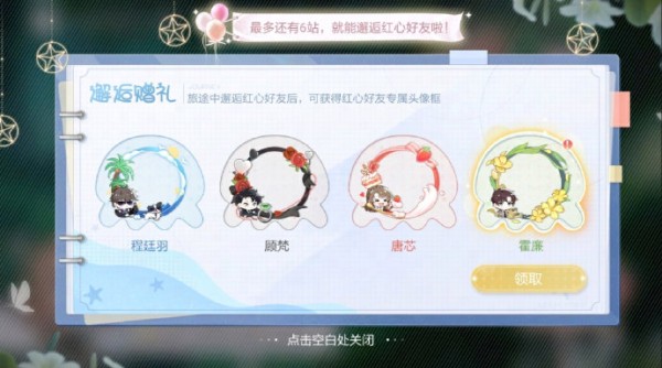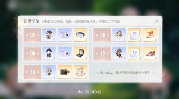 在约会的过程中,艺人们依旧能收到不少小礼物,红心好友贴纸、登台影像、红心好友专属头像框。收集完成所有结局,到达第十六站后,艺人们还将解锁“隐藏特典彩蛋”![哇]
