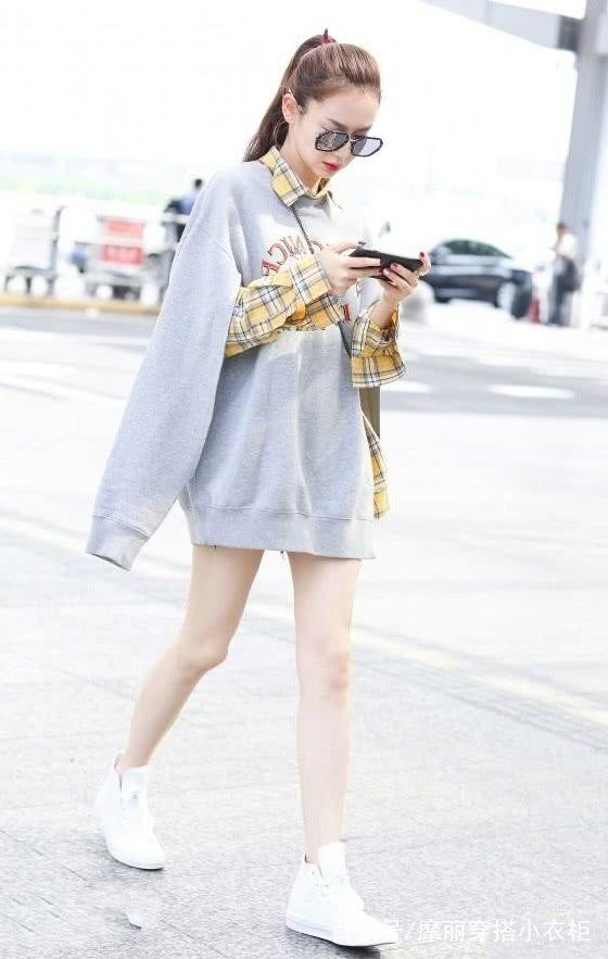 戚薇这身卫衣+衬衫的搭配,可是非常俏皮了。黄色的网格衬衫,青春活力,非常减龄。外搭一件灰色的套头卫衣,前襟的字母印花,可爱活泼。只是小编有点好奇,七哥的手是怎么从卫衣的胳膊下伸出来的呢?双眼紧盯手机屏幕的样子,简直不能太可爱。下身直接踩一双简约的小白鞋,这下装失踪的造型,大秀美腿,看起来好像也没有那么热。