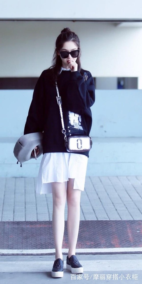 我七哥对衬衫和卫衣的搭配,是真爱了。黑色的套头卫衣,低调但不沉闷,内搭一件白色的衬衫,禁欲十足。较长的衣长,露出不规则的下摆,配上一双黑色的松糕鞋,衬得双腿更加白皙纤细,修长笔直,非常惹眼。