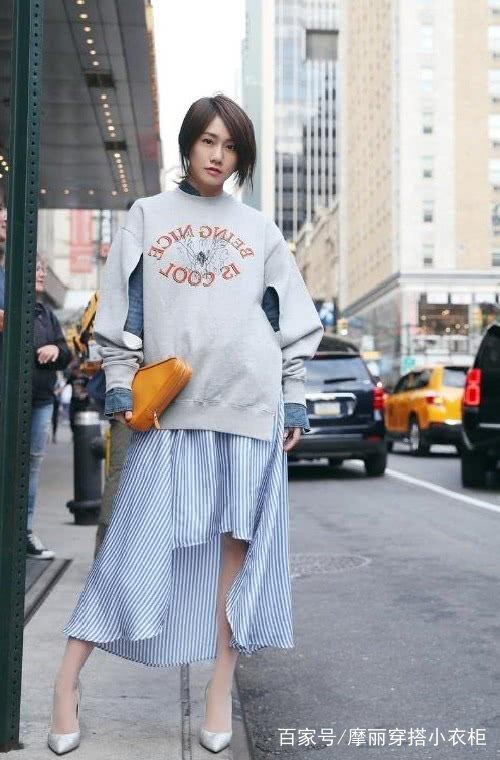 刘芸最近这身卫衣搭配衬衫的造型,可是没少被大家提及。 灰色的卫衣,版型太过宽松,显得有点笨重闷热,袖子处的开口设计,创意十足。搭配一件蓝白条纹的衬衫裙,不规则的下摆设计,配上一双银色尖头高跟鞋,显得非常别致有个性。
