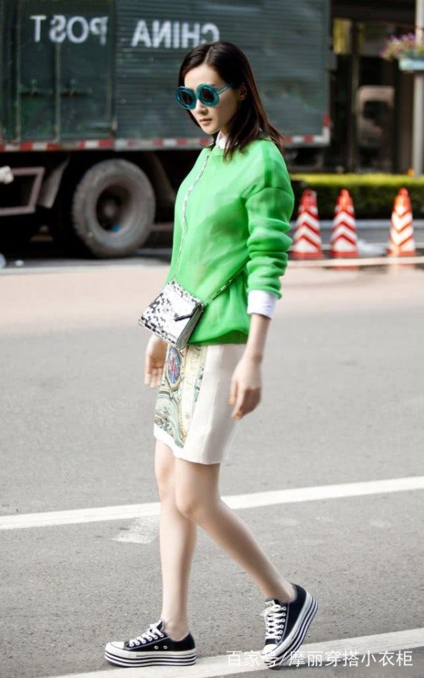 林鹏外穿一件绿色卫衣,内搭一件白色衬衫,随意挽起的袖子更具造型感。下身搭配一条米色的印花半身裙,和一双经典简约的帆布鞋,文艺范十足,看着甚是乖巧温婉。