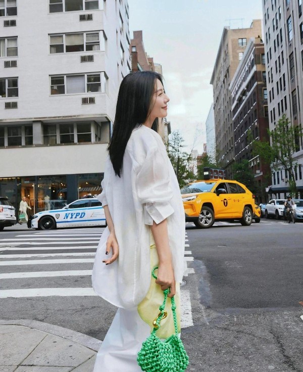咱先聊聊这第一套惊艳纽约街头的打扮。如果你仔细观察就会发现,她这身衣服的逻辑其实特别简单,就是白色叠穿。里头是一件再普通不过的白色修身背心,这种背心咱们逛超市都能买到同款,但关键就在于外面那件半透明的白衬衫。这衬衫的面料薄得像层烟儿,松松垮垮地披在肩上,领口还特意敞开,锁骨若隐若现的。这种穿法聪明在哪儿?它把那种“我没刻意打扮,只是随便穿穿”的慵懒范儿给拿捏住了。
