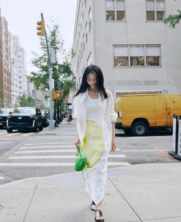 下半身这件黄白印花的裙子更是神来之笔。你想啊,要是全身都煞白,那确实有点像去参加什么严肃仪式,但这抹柠檬黄就像是往白开水里投了一片鲜柠檬,瞬间就灵动起来了。这裙子长度到了脚踝,走起路来晃晃悠悠的,不仅把腿上的肉遮得严严实实,还特别显气质。再加上她拎着那个亮绿色的编织包,这种撞色不仅没翻车,反而显得整个人特别清爽。这种搭配其实挺适合咱们梨形身材的姐妹,上身紧凑显瘦,下身飘逸遮肉,简直是教科书级别的示范。