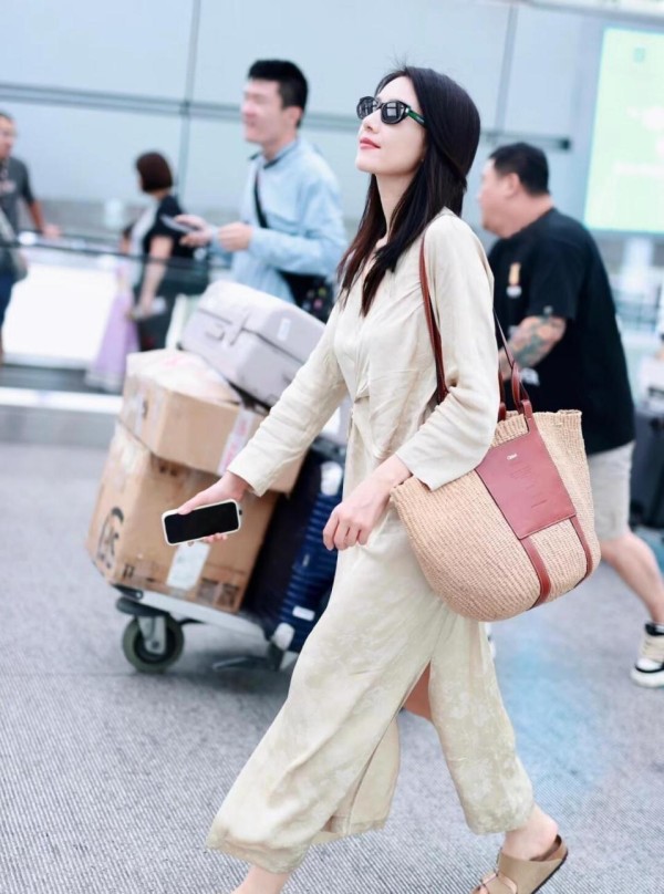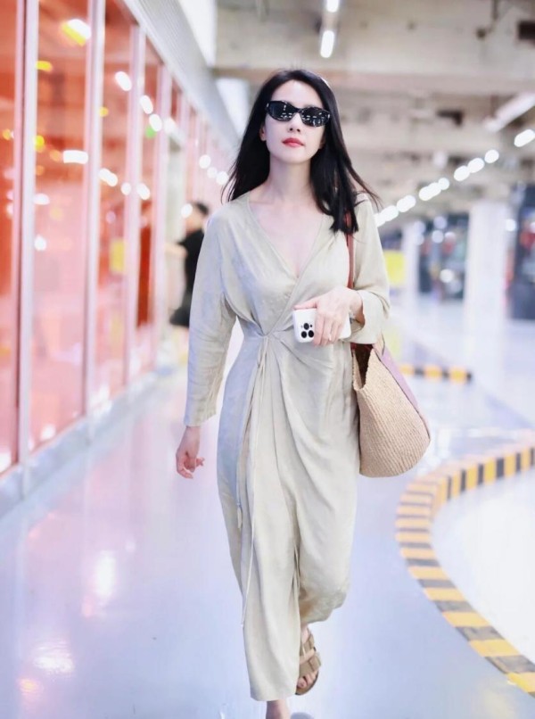 再看看她在机场被拍到的那套浅杏色连衣裙。大家都知道,坐飞机、赶火车最怕的就是束缚,恨不得穿睡衣出门,但高圆圆这身浅杏色长裙,愣是把舒适和时髦平衡得死死的。这裙子乍一看没啥特别,但腰间那个扭结设计真的很有心思,它不是那种死板的收腰,而是像随手挽了个花,一下子就把腰线提上去了,哪怕是有点小肚子也能藏得很好。