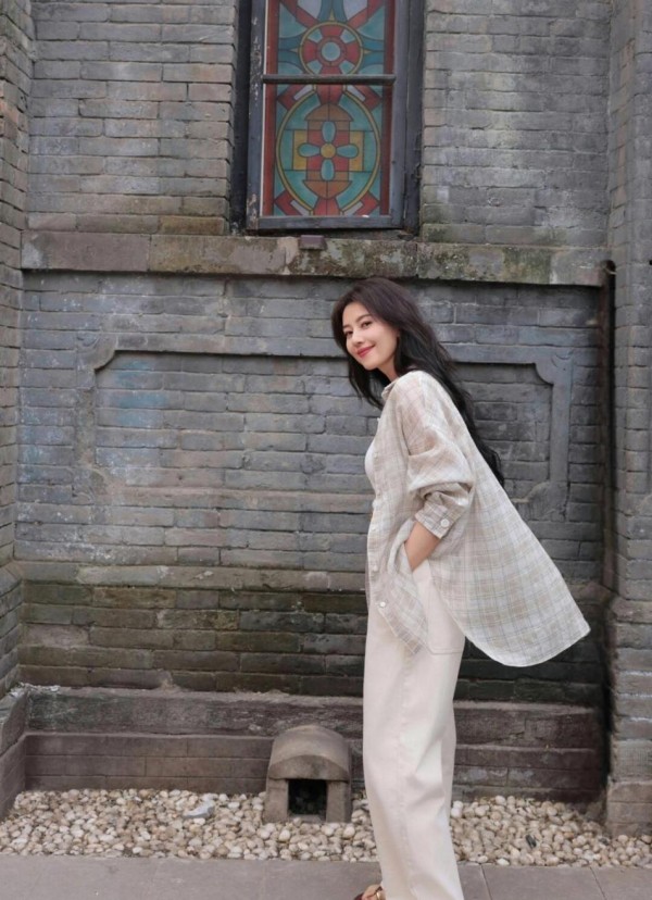 后来她回到了老北京的胡同里,穿衣风格又变了,变得像个文艺女青年。这套衣服我个人最喜欢,因为它太接地气了。里头是一件带纽扣的亨利领背心,外头套件灰格纹的衬衫,松松垮垮地往那一站。这场景你品品,青砖红门,斑驳的光影,配上这一身素雅的打扮,简直像从旧照片里走出来的。