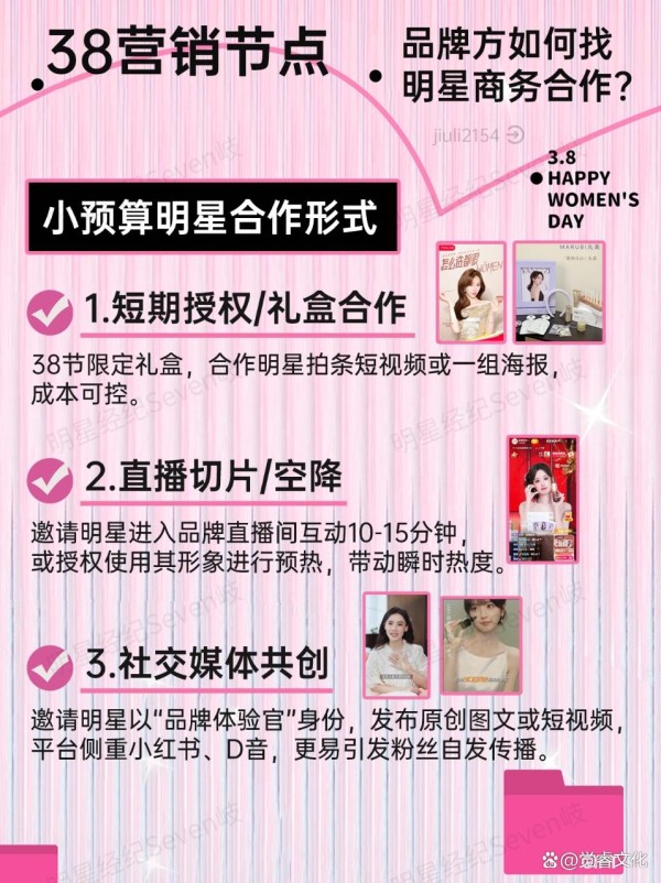 1.短期授权/礼盒合作:38节限定礼盒,合作明星拍条短视频或一组海报,成本可控。