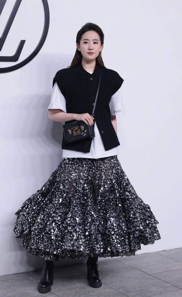 2025年5月巴黎早春秀,她放弃华丽礼服,选择路易威登工装风衣加短裤加马丁靴。标志性黑长直披肩、小烟熏淡妆,简约利落、又酷又仙。当其他明星还在用染烫造型博眼球时,刘亦菲仅凭最原始的黑发就完成了对时尚圈的“美学碾压”。