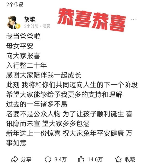 1月31日下午14:30左右,胡歌在他的个人账号上官宣当爸爸了!老婆是圈外人!
