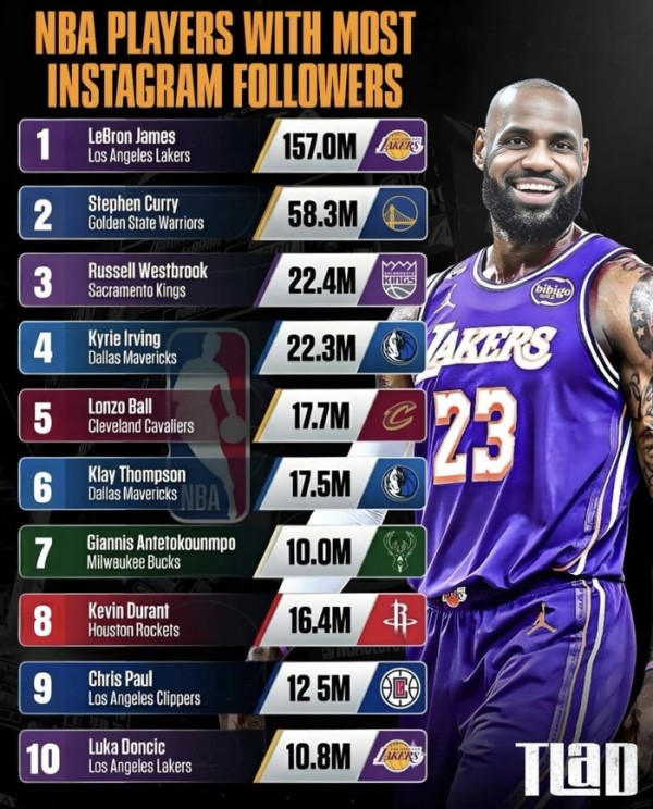 最新社交媒体粉丝数量排行榜,詹姆斯第一,2至4名总和都没他多