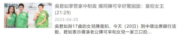 4月20日,据港媒报道,吴君如带着女儿陈是知出席活动,她透露一家三口首度合作拍摄广告,这则广告也是女儿的出道作。