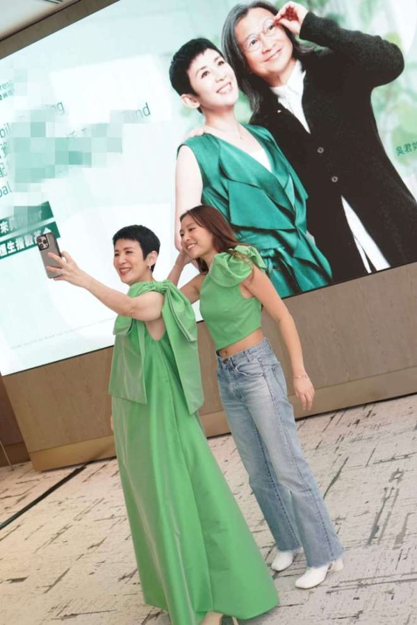 活动现场放置了一家三口拍摄的广告照,吴君如母女看到后兴奋不已,拿着手机不停跟广告照合影。