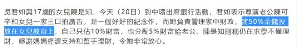 吴君如还提到,自己手握家中经济大权,但她只用10%,陈可辛用5%,50%都会投放到女儿的教育上。