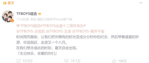 今天,2025年8月6日零点,TFBOYS组合官微深情发文,纪念组合出道十二周年。文字间透露出对往昔时光的怀念,以及夏日重聚的期待。