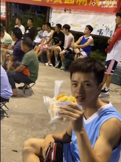 ▲石学念看“村BA”到天亮,啃面包充饥。视频截图