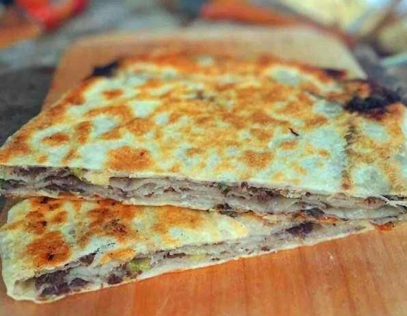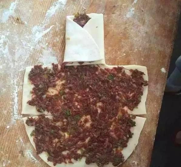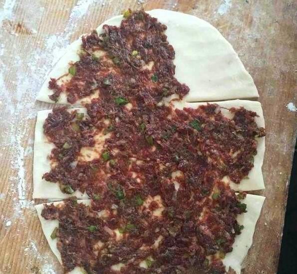 然后用擀面杖擀成原型,并且在上面切出几个小口,像下面图片中的一样。然后将肉馅均匀的涂抹在上面,但是要注意在右上角留下一个小角。