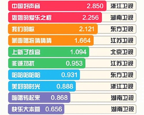 收视率方面,《中国好声音》以2.850%的收视率排名第一。尽管在网络上的热度不高,但还是赢得了电视观众的青睐。排名第二的是《姐姐的爱乐之旅》,收视率为2.256%,将《我们的歌》挤到了第三位。作为《乘风破浪的姐姐》的续篇,《姐姐的爱乐之旅》的节目质量并不高,只是在吃“老本儿”而已。