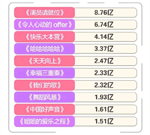 《令人心动的offer》排名第二,话题量为6.74亿。由此不难发现,最近几年有关素人的综艺节目有明显上升的趋势,继《心动的信号》之后,《令人心动的offer》也成为了同类型节目中的佼佼者。当然了,节目中的素人是相对于娱乐明星而言,对于普通人来说依旧有点遥不可及。不论是《心动的信号》、还是《令人心动的offer》,素人嘉宾都是高学历的高富帅和白富美,离真正的社会大众仍然有一定的距离。