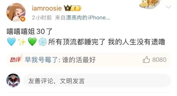 粉丝控评,路人吃瓜,我这种纯看热闹的,盯着她头像旁边那行签名:娱乐圈边缘人。