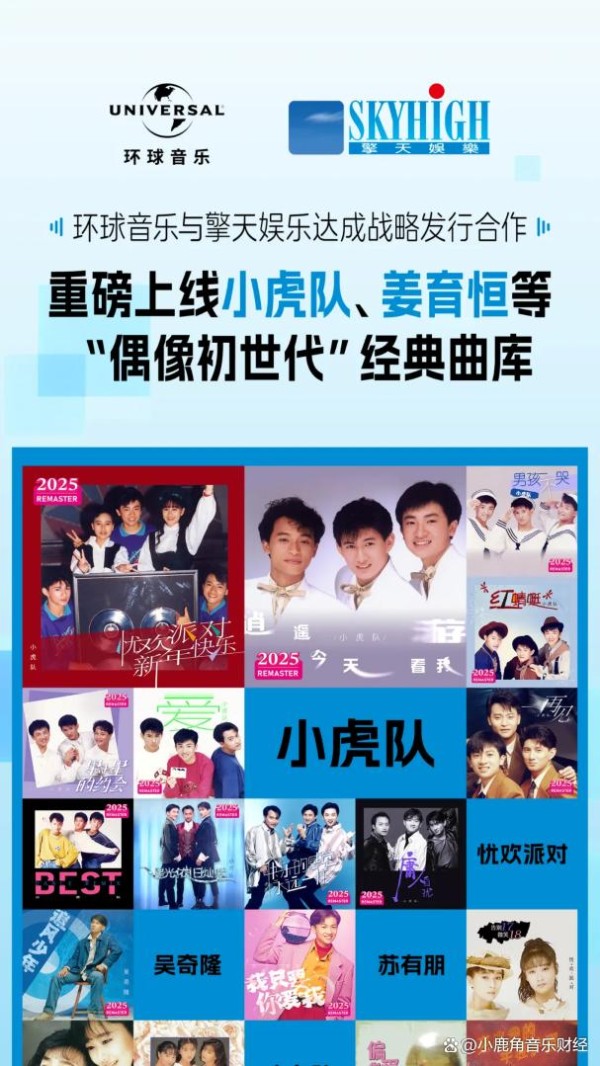 9 月初,环球音乐与擎天娱乐达成的战略发行合作,合作上线600多首歌曲、66张专辑,包括小虎队全部曲库、吴奇隆与苏有朋的经典单飞专辑以及姜育恒的经典专辑,也包括忧欢派对、红孩儿、少女队等知名团体与艺人的曲库,再现中国台湾上世纪80年代流行乐的“黄金时代”。(回顾:环球音乐与擎天娱乐达成战略发行合作)