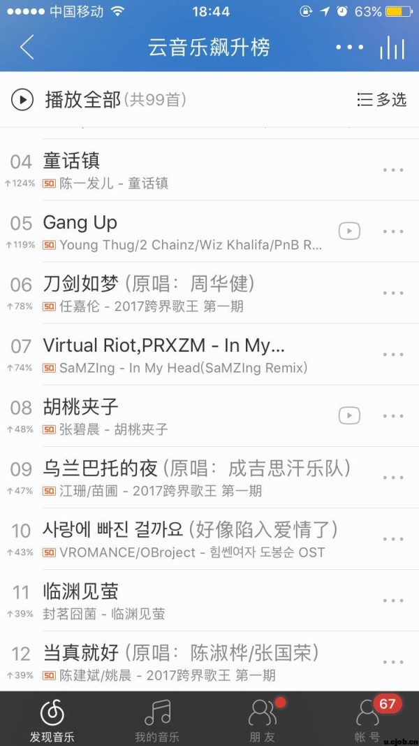 (4月17日,2017《跨界歌王》多首歌曲进入网易云音乐飙升榜前列)