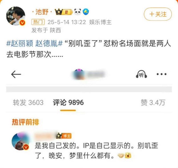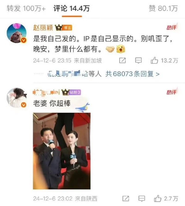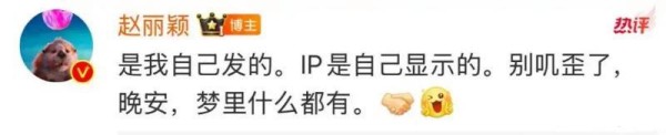 然而,鉴于微博的 IP 显示位于北京,故而遭到粉丝的质疑,认为并非其本人所发,是出自工作人员之手,评论区吵不停时,赵丽颖在评论区回怼粉丝,表示就是她本人发的,让大家不要再“叽歪”