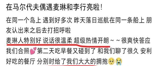 而这已经不是唯一一位在马尔代夫碰见他们夫妻的网友了,还有人晒出合影,说李行亮和麦琳都很愿意和粉丝互动,合影时麦琳还主动挽着网友的胳膊,一点也不做作。