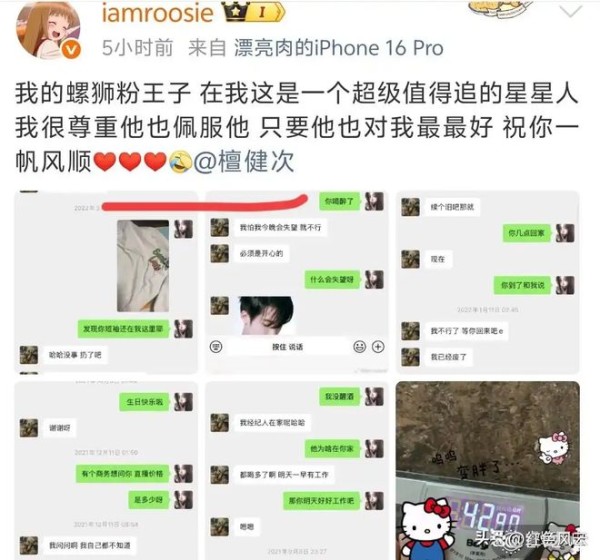 对檀健次的爆料同样充满槽点。她亲昵地称呼对方为“螺蛳粉王子”,晒出的聊天记录里,对方语气熟稔甚至有点粘人,还声称檀健次有件衣服落在自己这里,且有同款为证。截图里的头像、表情包也被她解读为“实锤”,可檀健次团队根本没给她留面子,直接硬刚“凭空捏造,追究法律责任”,态度坚决得不留任何余地。