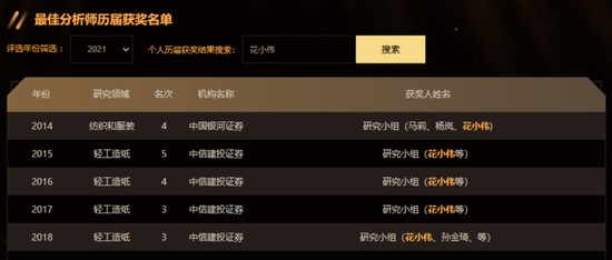 从事卖方多年,花小伟曾多次登上新财富榜单。在中信建投研究所期间,花小伟所在研究小组曾在轻工造纸领域连续四年登榜,2017、2018两年均获得第三名的成绩。