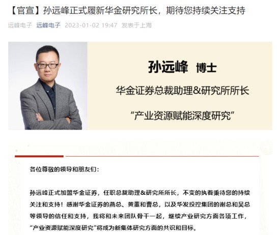 近日,明星分析师孙远峰亦在其“远峰电子”公众号上官宣履新华金证券研究所所长的消息。孙远峰表示,其将和未来团队骨干一起,继续产业研究方面各项工作,“产业资源赋能深度研究”将成为新集体研究方面的共识和目标。