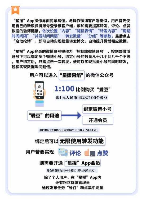 用户可以进入“星援网络”的微信公众号,以扫码方式进行充值,充值后以1:100比例购买“爱豆”,即1元人民币可以买100个爱豆。“爱豆”的用途主要是绑定微博小号和开通会员。用户绑定1个微博小号需要10个爱豆(即人民币0.1元),绑定后可以无限使用转发功能。用户若要实现评论、点赞操作,则需要开通“星援”App会员,月会员费用为2000个爱豆(即人民币20元)。除了个人用户,在“星援”App内,还有粉丝群体管理员,通过发布任务“号召”粉丝集中刷量。