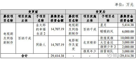 6月13日,百纳千成发布了募集资金投资项目变更的公告。原本2.94亿元投资电视剧《金太郎的幸福生活2》、《同龄人》,变更为2.94亿元投资6部电影、电视剧。