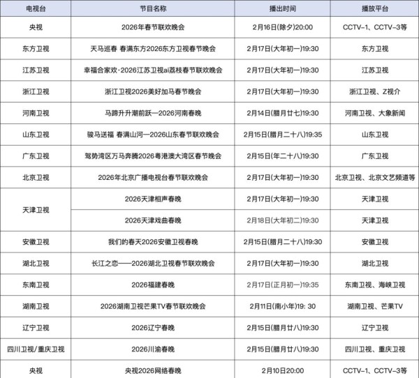 2026卫视春晚排期+阵容全盘点