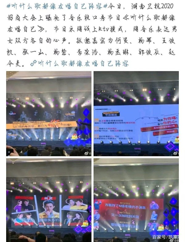 今日,湖南卫视2020招商大会曝光了全新音乐脱口秀节目《听什么歌都像在唱自己》的基本信息,值得一提的是,此档综艺的拟邀嘉宾阵容强大,采用男女星搭档的模式。