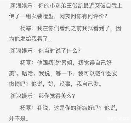 王俊凯和杨幂私下关系其实也很好,会一起打游戏。而且小迷弟王俊凯第一次穿女装拍照的时候还会发给杨幂看,小凯对杨幂说“幂姐,我觉得自己好美”,杨幂看到之后反应也很逗,说“等一下,我可以截个图发微博吗?”,结果小凯傲娇地说:“好,没事,我自己发”。最后幂姐还来了一句“这是你的新癖好?”,小凯无奈表示:“并不是”。